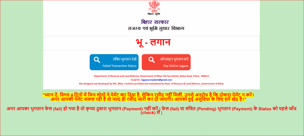 - राजस्व एवं भूमि सुधार विभाग बिहार सरकार पुराना सचिवालय, बेली रोड, पटना – 8000015